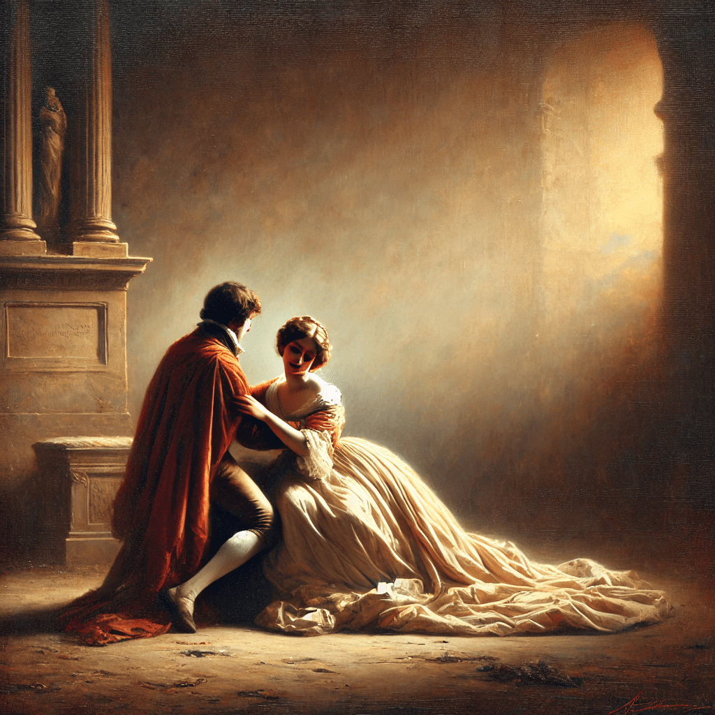 Description: In this piece, we find two figures wrapped in a quiet, private moment, as if the world around them has faded. There’s a softness to the light streaming in, almost like it’s cradling them, casting warm tones that make the scene feel both gentle and intense. The details of their clothing and the subtle textures in the background give a sense of time and place, but it’s the way they’re connected—so delicately—that draws you in. There’s something beautifully timeless about it, a reminder of those fleeting moments when everything else disappears, leaving just two souls, together in their own world.