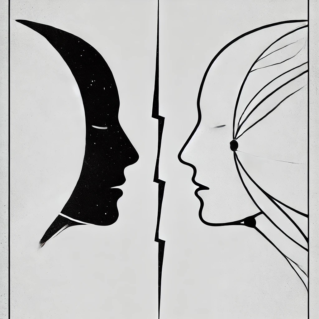 Description: This artwork captures the tension between two contrasting entities—the mechanical and the organic, the logical and the emotional. The dark, star-speckled figure represents The Machine: pure logic, unburdened by emotion but intrigued by it. The fractured, softer figure embodies The Hybrid: torn between humanity and detachment. Divided by a thin, jagged line, they face each other in silence, each seeking something beyond themselves. This piece invites reflection on the boundaries of identity and the delicate balance between feeling and reason.